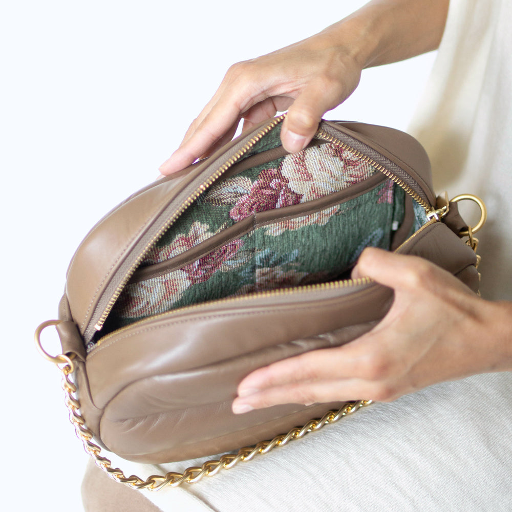 サンドベージュのエチオピアシープスキンのボディに、優しいグリーンのシェニールゴブランのライニングを合わせた限定モデル。バッグを開けるたびに広がる華やかなバラのモチーフと柔らかな肌触りが、小さなときめきを運んでくれます。