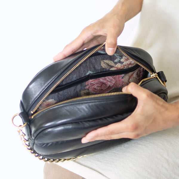 ブラックのエチオピアシープスキンのボディに、シックなグレーのシェニールゴブランの裏地を合わせた限定モデル。バッグを開けるたびに広がる華やかなバラのモチーフと柔らかな肌触りが、小さなときめきを運んでくれます。