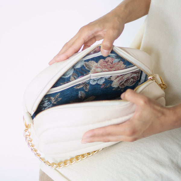 アイボリーのエチオピアシープスキンのボディに、爽やかなターコイズブルーのシェニールゴブランの裏地を合わせた限定モデル。バッグを開けるたびに広がる華やかなバラのモチーフと柔らかな肌触りが、小さなときめきを運んでくれます。