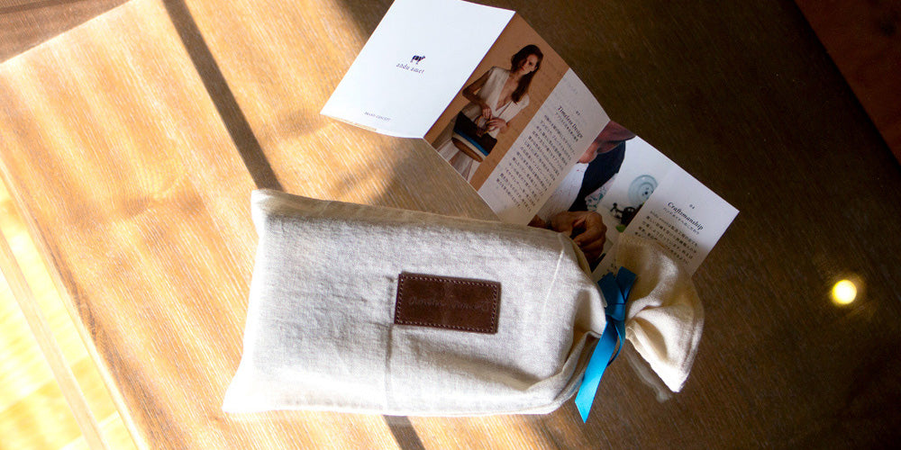 ラッピングはエチオピア製のコットン布地にロゴをあしらったダストバッグにお包みしてお届けします。ご購入後も大切な製品の保管に末長くご活用いただければ幸いです。