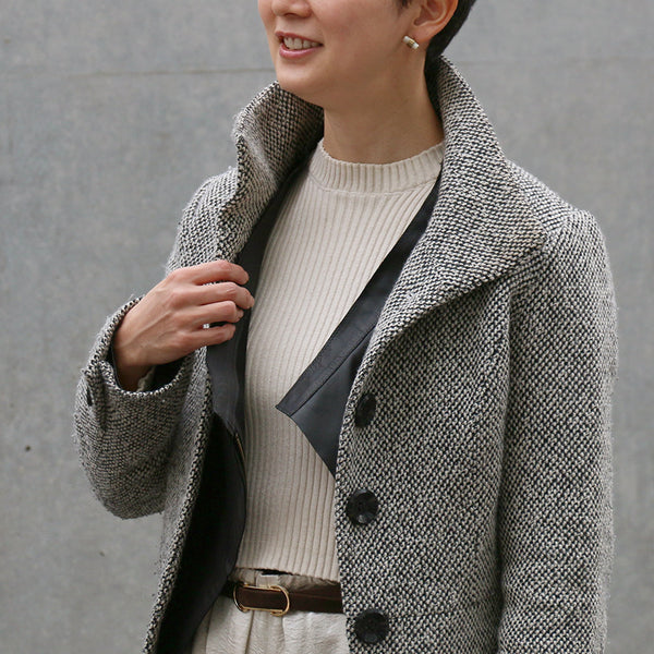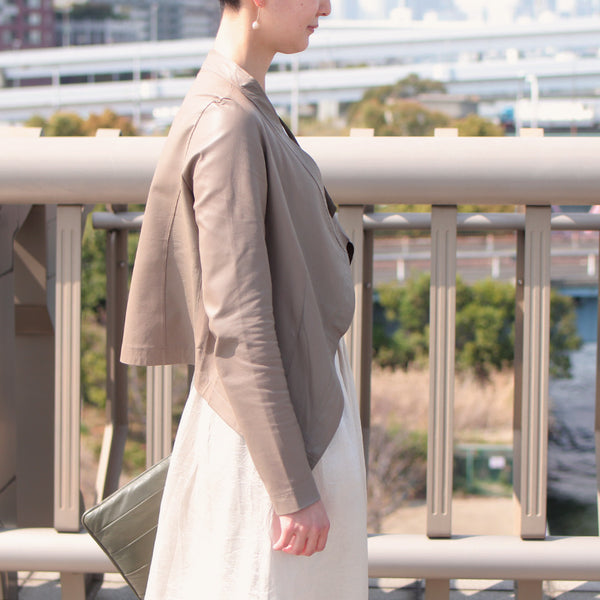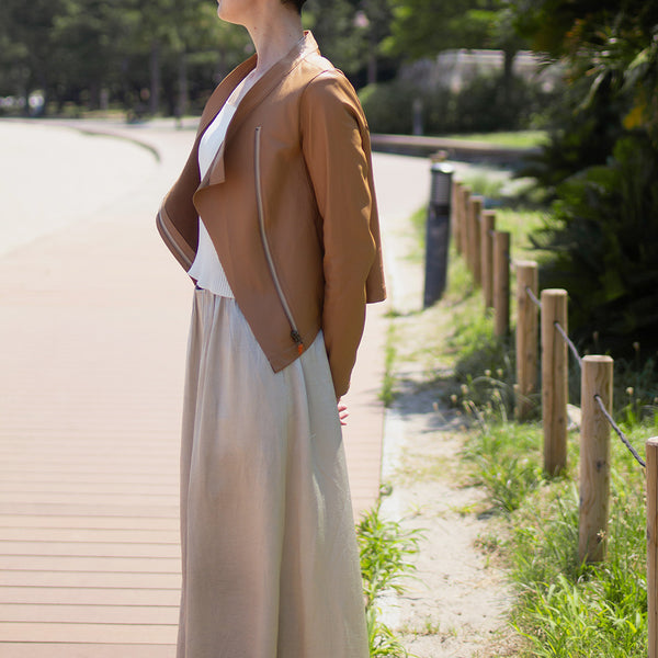 薄くて軽やかなので、春夏に着ても明るくさわやかな印象。畳むと小さくなるので、ちょっと暑いときはBagにINすることも。逆に真冬は、ダウンやロングコートに下にももたつかずすっきりと着用可能です。