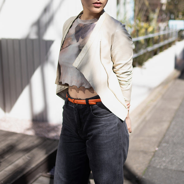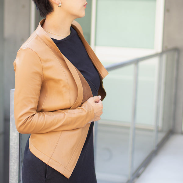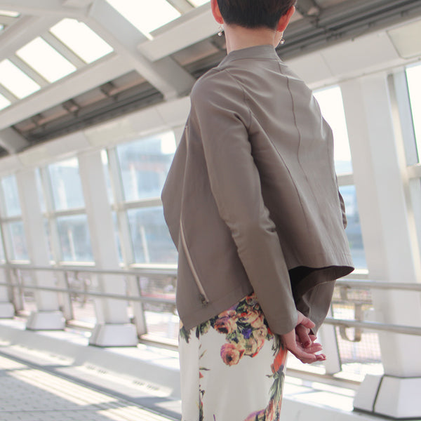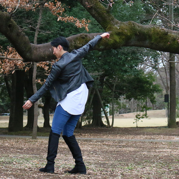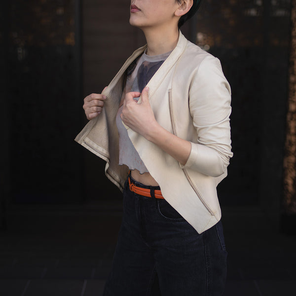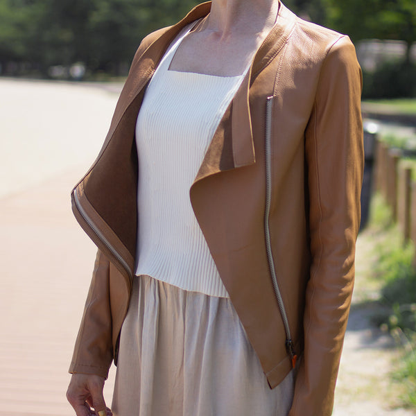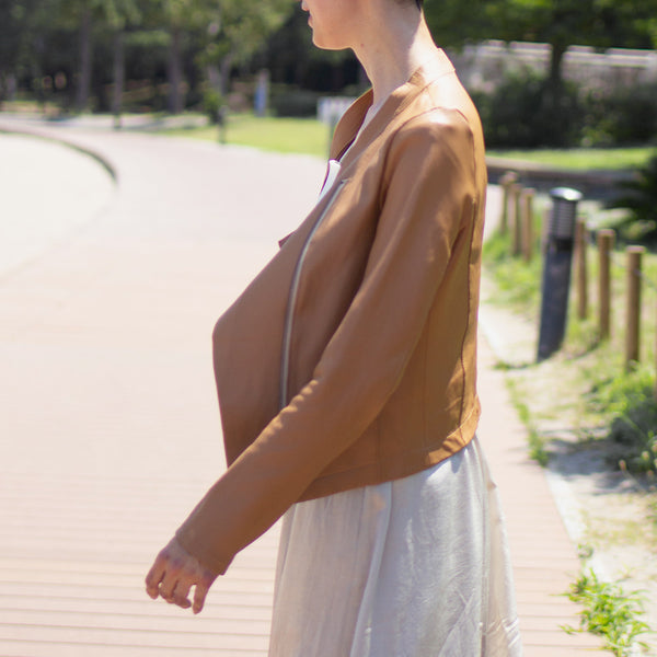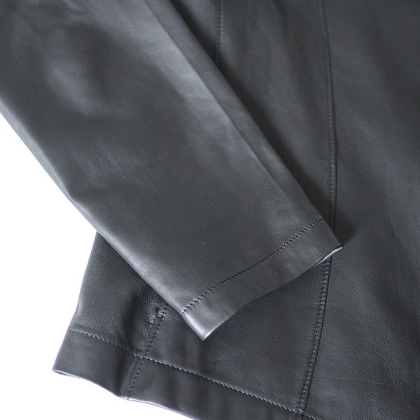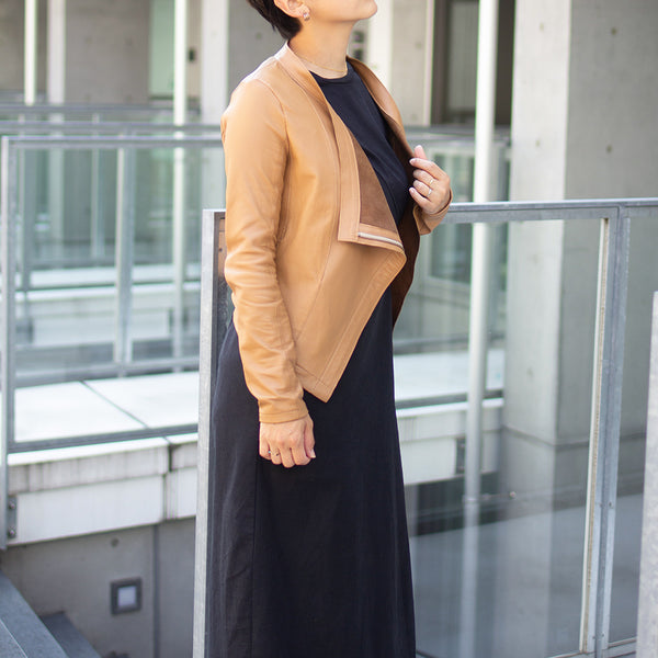 「見た目は素敵だけど、硬くて重くて長くは着ていられない」「窮屈」—レザージャケットにそんなイメージをお持ちではありませんか? 最高峰の羊革を、新たに開発したオリジナルの技法で鞣して作られたEbreezeは、表面はもちろん裏面もやわらかくてしっとり、なめらかな感触。ストレッチ性も高く動きやすいのも特徴です。触れている間ずっと幸せな気持ちになれる、一度袖を通したら二度と脱ぎたくなくなる、そんなレザージャケットです。