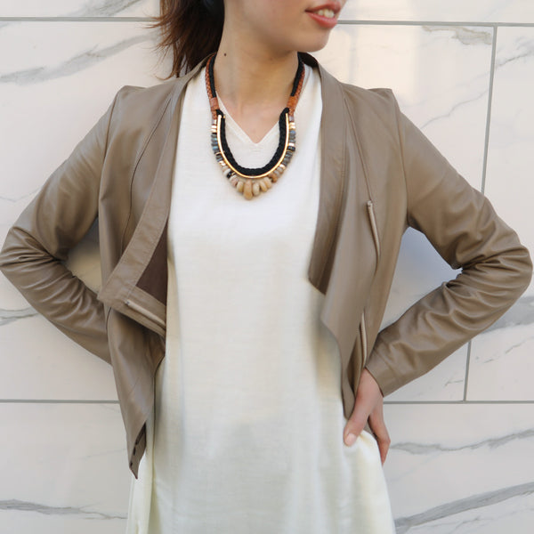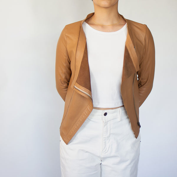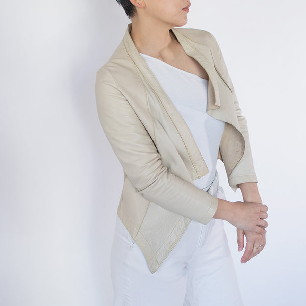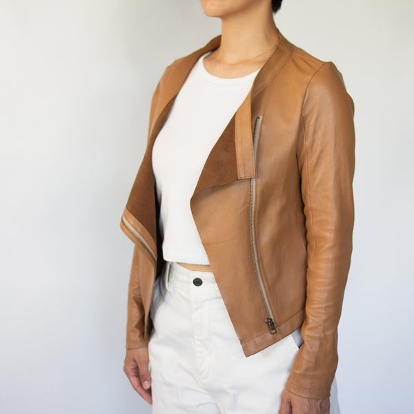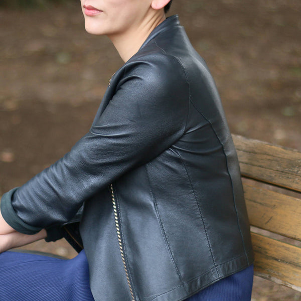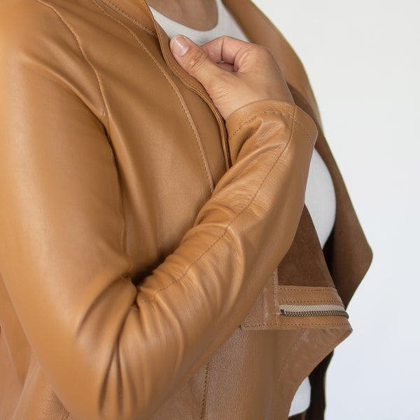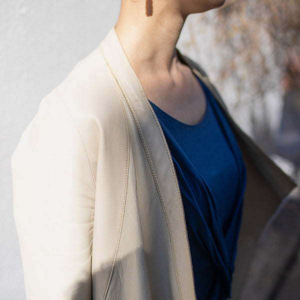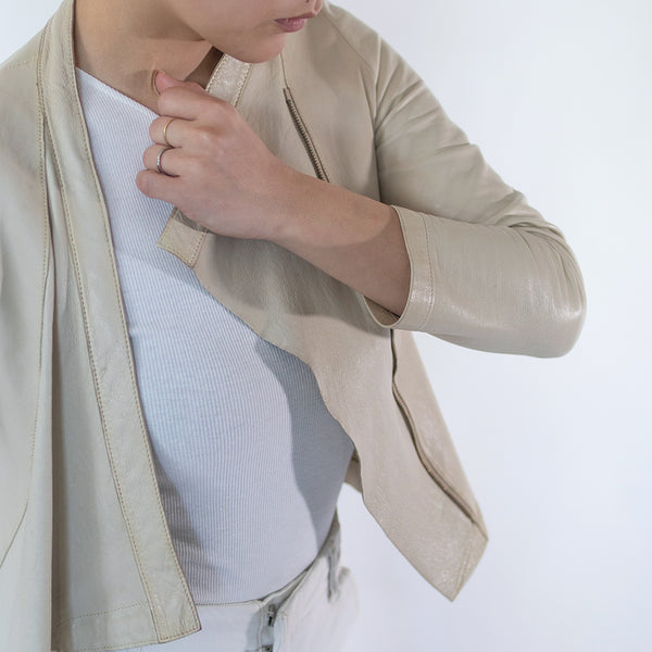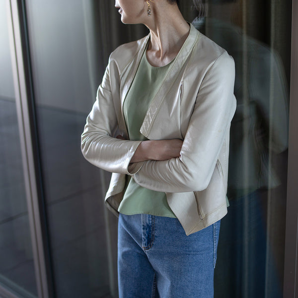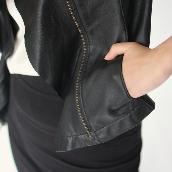 「見た目は素敵だけど、硬くて重くて長くは着ていられない」「窮屈」—レザージャケットにそんなイメージをお持ちではありませんか? 最高峰の羊革を、新たに開発したオリジナルの技法で鞣して作られたEbreezeは、表面はもちろん裏面もやわらかくてしっとり、なめらかな感触。ストレッチ性も高く動きやすいのも特徴です。触れている間ずっと幸せな気持ちになれる、一度袖を通したら二度と脱ぎたくなくなる、そんなレザージャケットです。