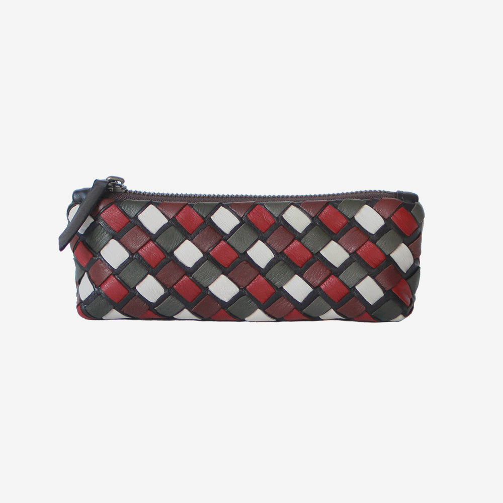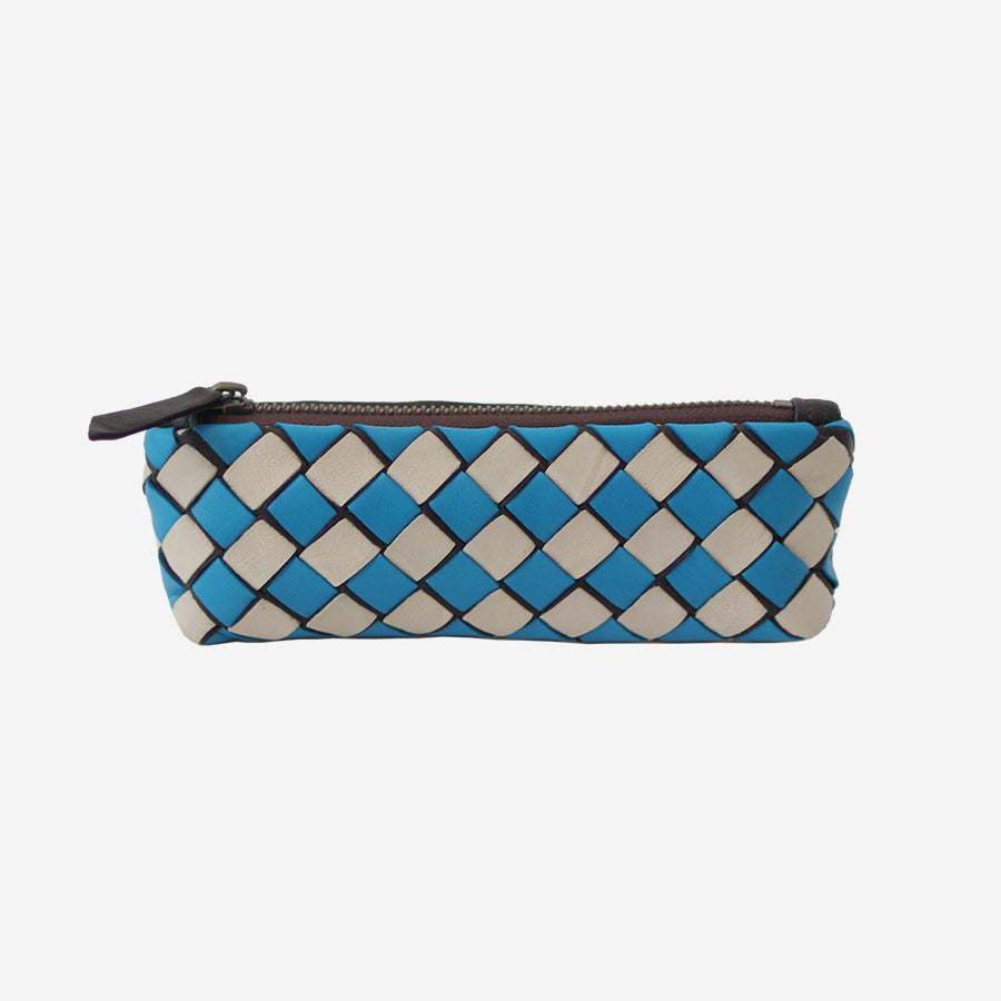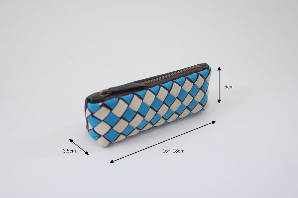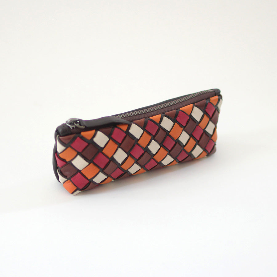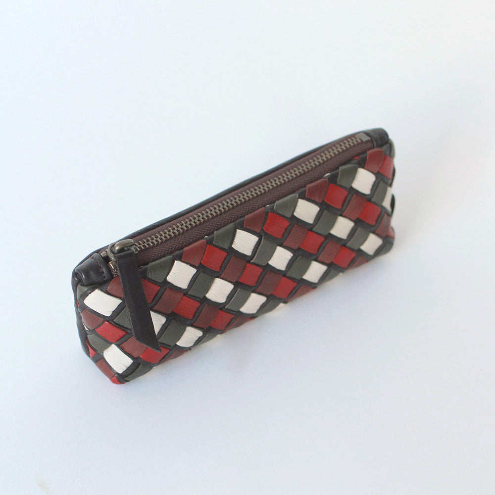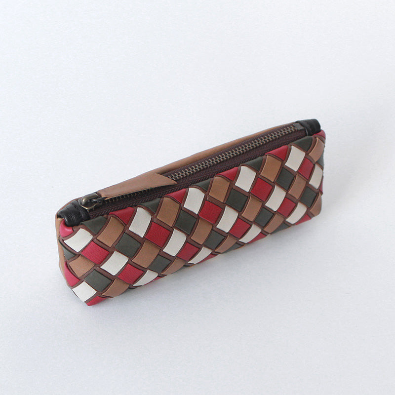 目にしただけで元気になれそうな、鮮やかなレザーを、職人が時間をかけてひとめひとめ編み上げて、まるで工芸品のようなペンケースができました。表目はもちろん、内側のロゴやファスナーの引き手もエチオピアシープスキンを贅沢に使用しています。使うほどに味わいを増す革の感触をどうぞお楽しみください。