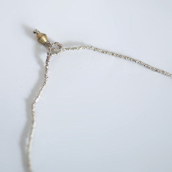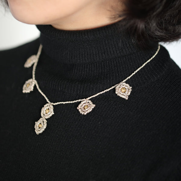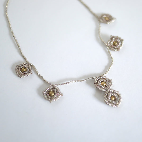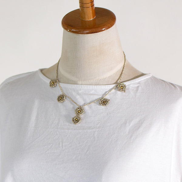 細かなシードビーズのチェーンに、小花をイメージさせるスクエアの編み込みモチーフが連れられたネックレス。シンプルながらも華やかさを感じさせるデザインです。