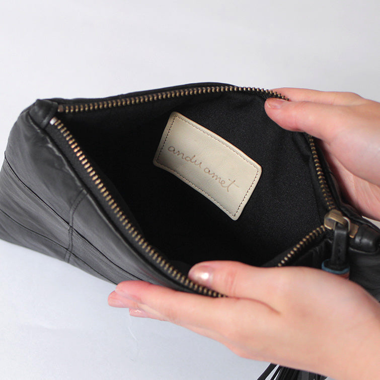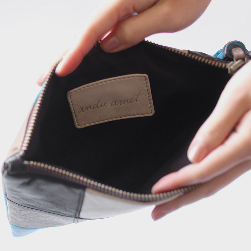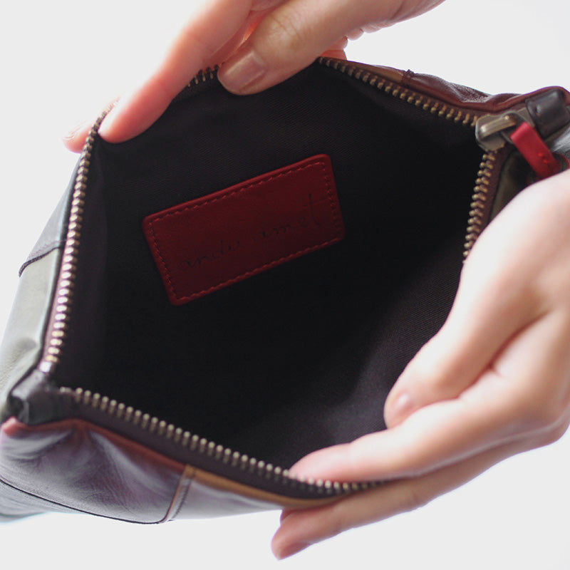 andu ametの製品は、極上のエチオピアシープスキンが持つ風合いや質感をお楽しみいただくために、素上げ(顔料等による皮膜加工を行わず、革が持つ自然の風合いを残して、素に近い状態で仕上げる方法)のオリジナルレザーを使用しております。そのため、色むらや小さな傷、しわなどがみられるほか、色移りや退色が起こる場合がございます。