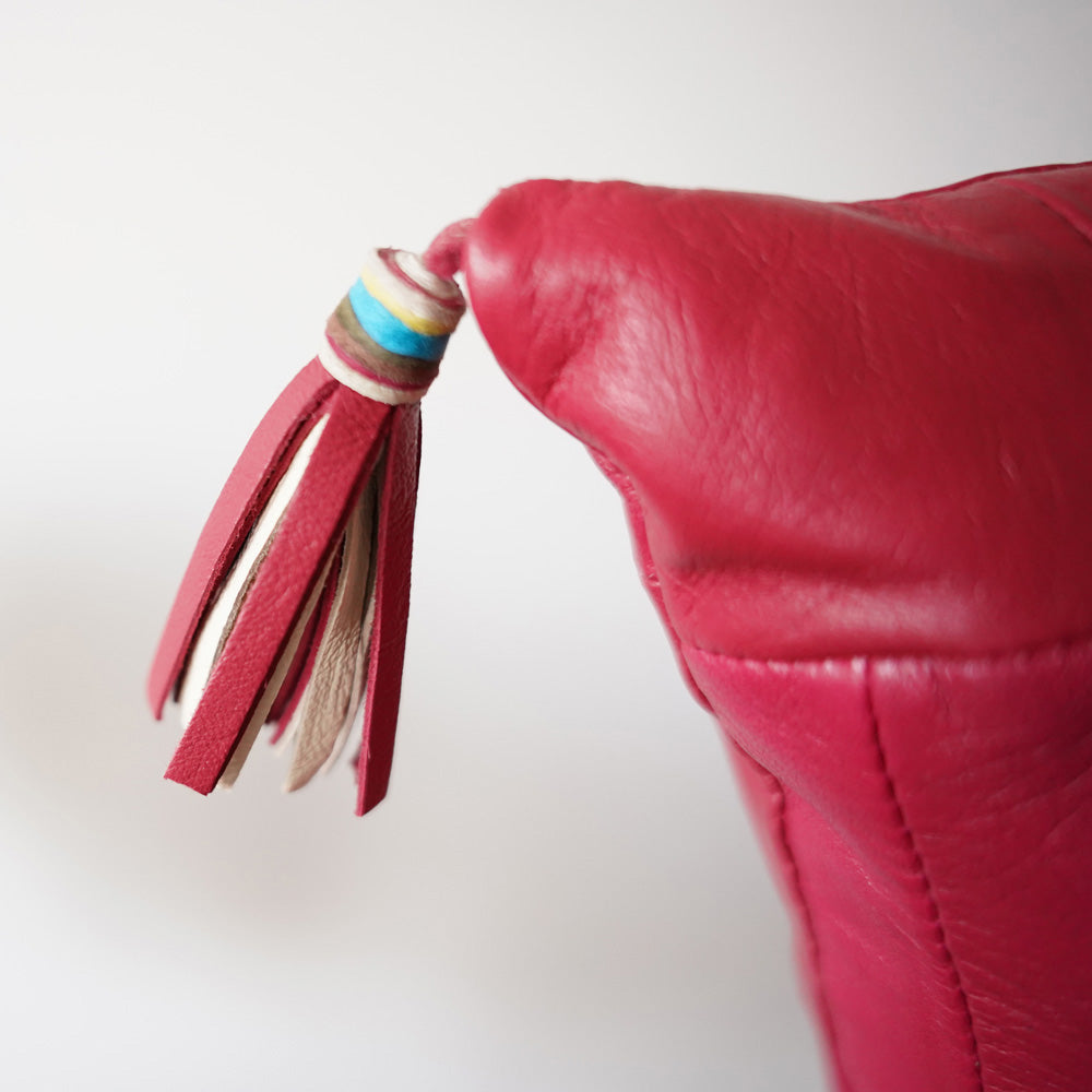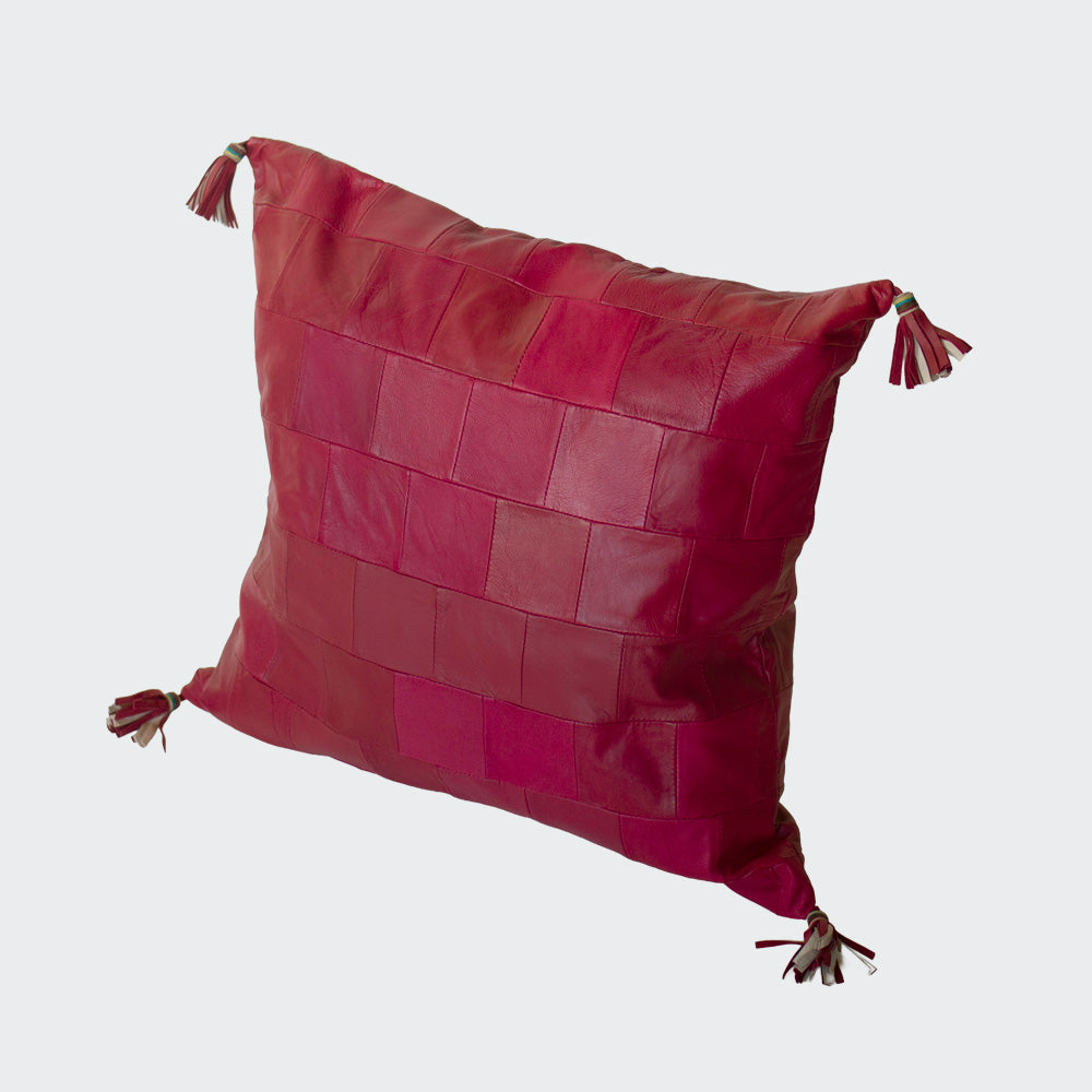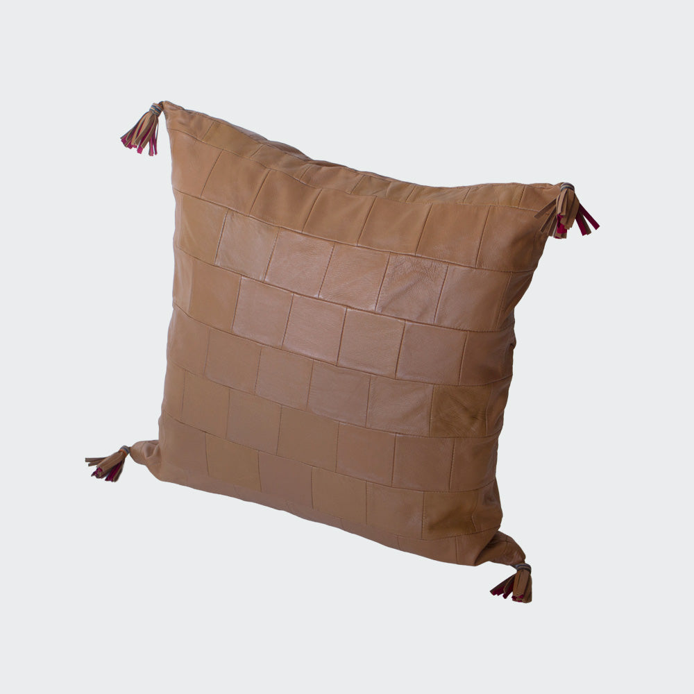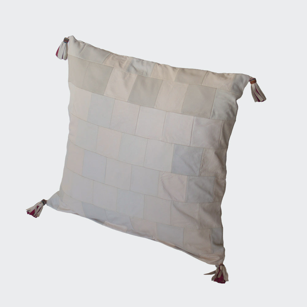 様々な表情のレザーを熟練職人が手作業でパッチワーク。四隅には小さなタッセルをあしらい、軽やかなアクセントをプラス。レザーのグラデーションが描くモザイク模様は、唯一無二の美しさ。ひとつソファーに置くだけで抜群の存在感を放ちます。