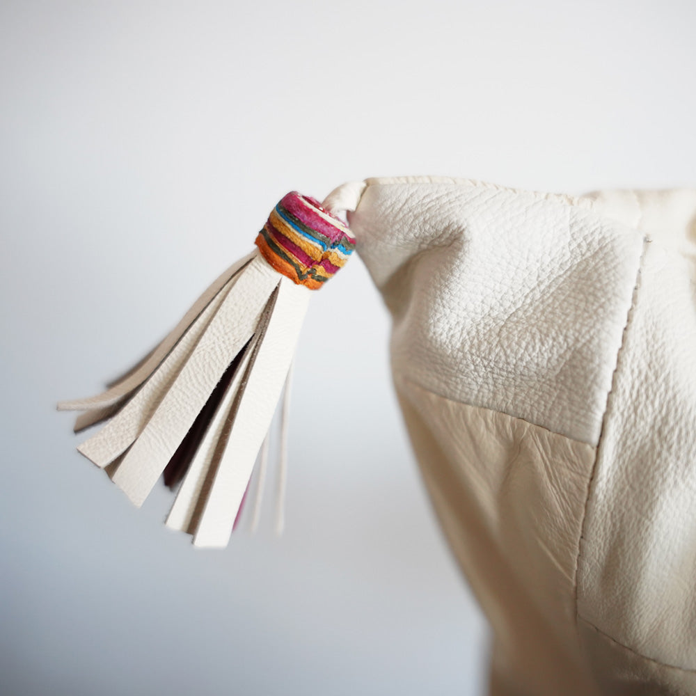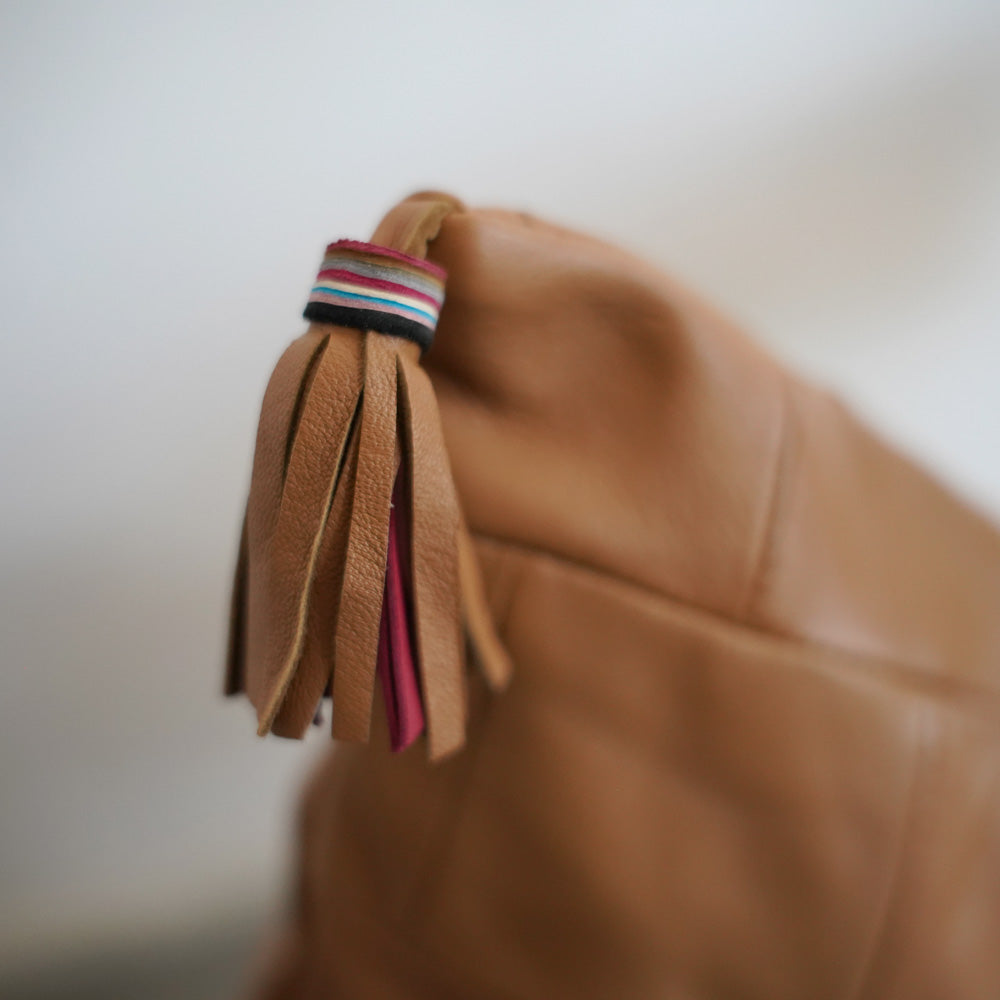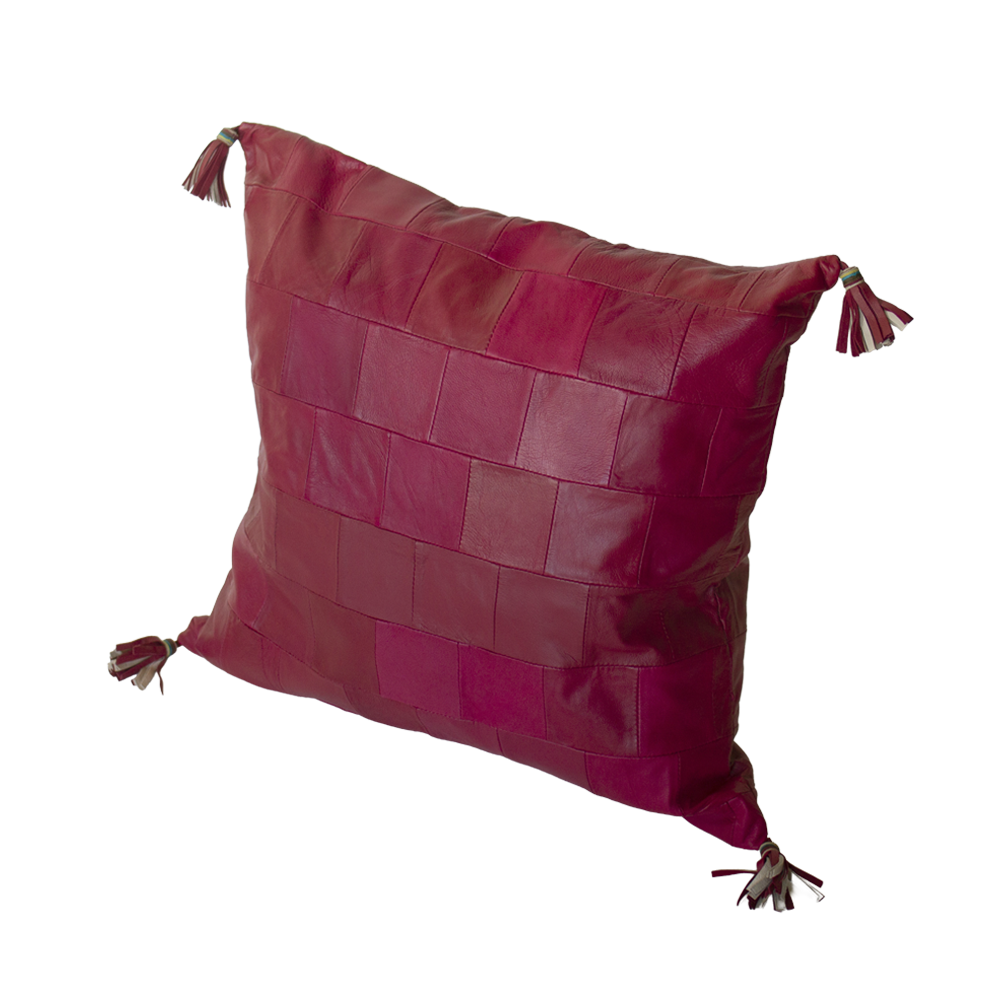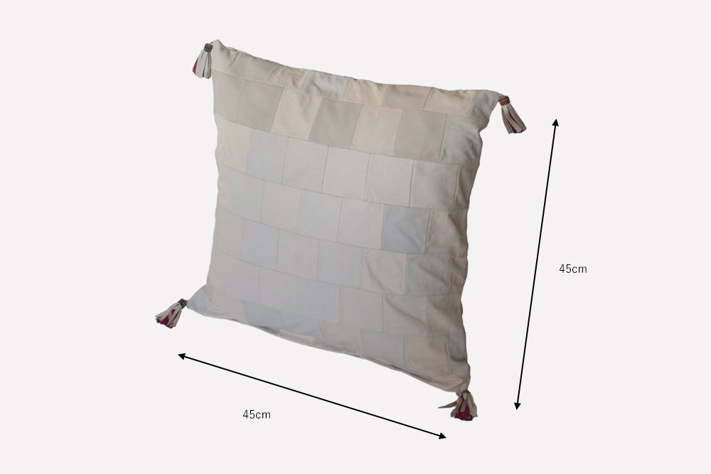 様々な表情のレザーを熟練職人が手作業でパッチワーク。四隅には小さなタッセルをあしらい、軽やかなアクセントをプラス。レザーのグラデーションが描くモザイク模様は、唯一無二の美しさ。ひとつソファーに置くだけで抜群の存在感を放ちます。